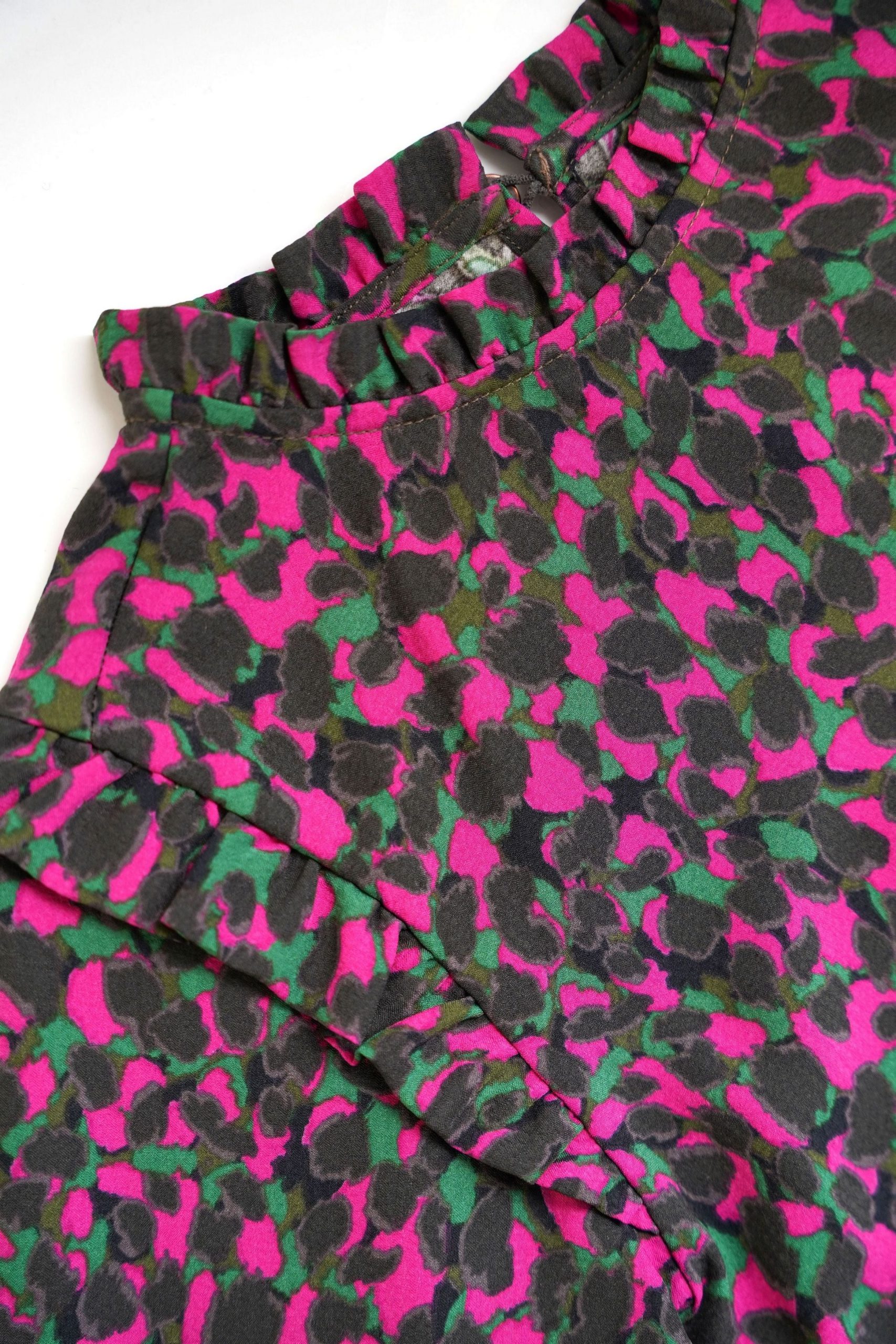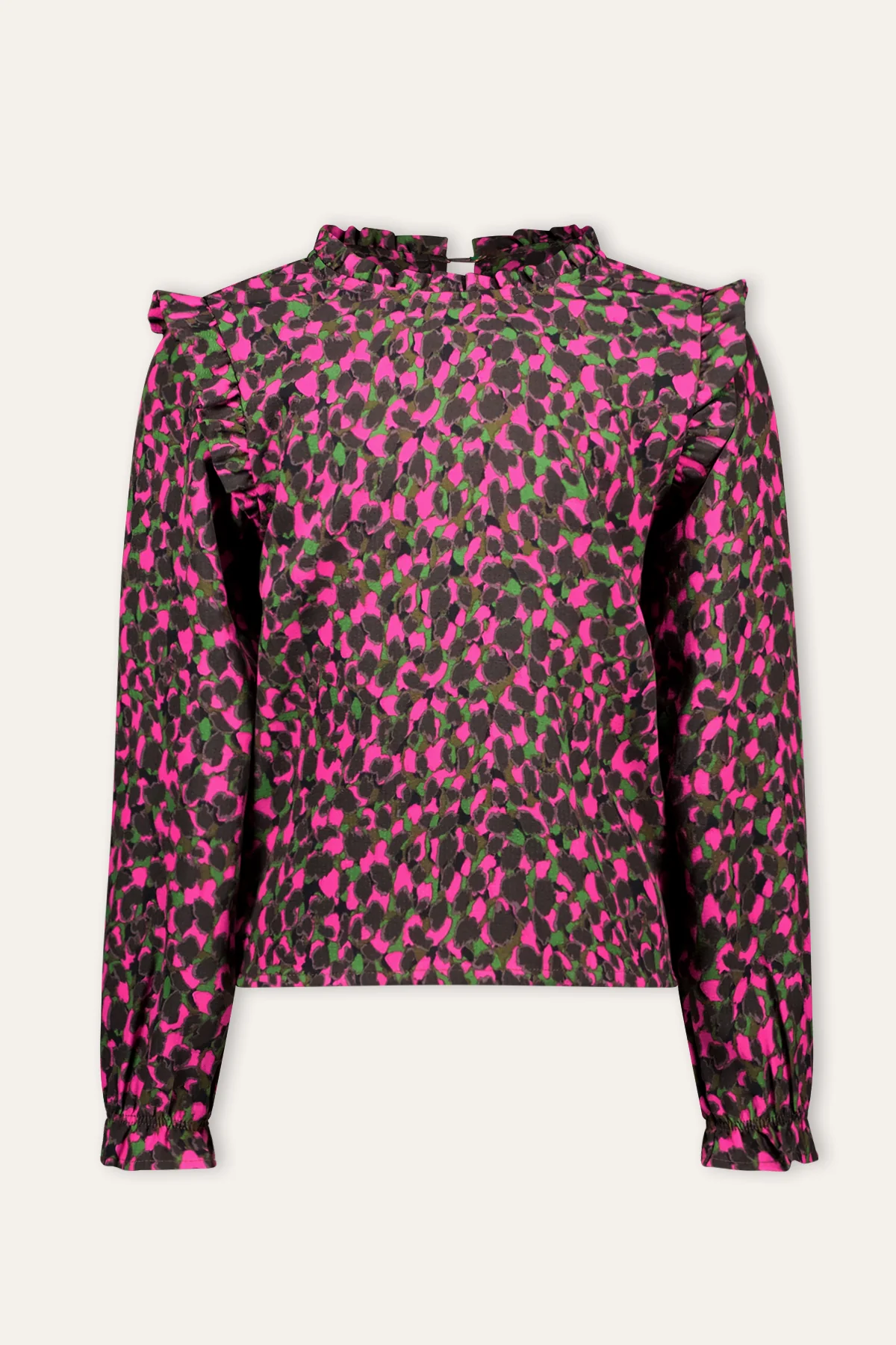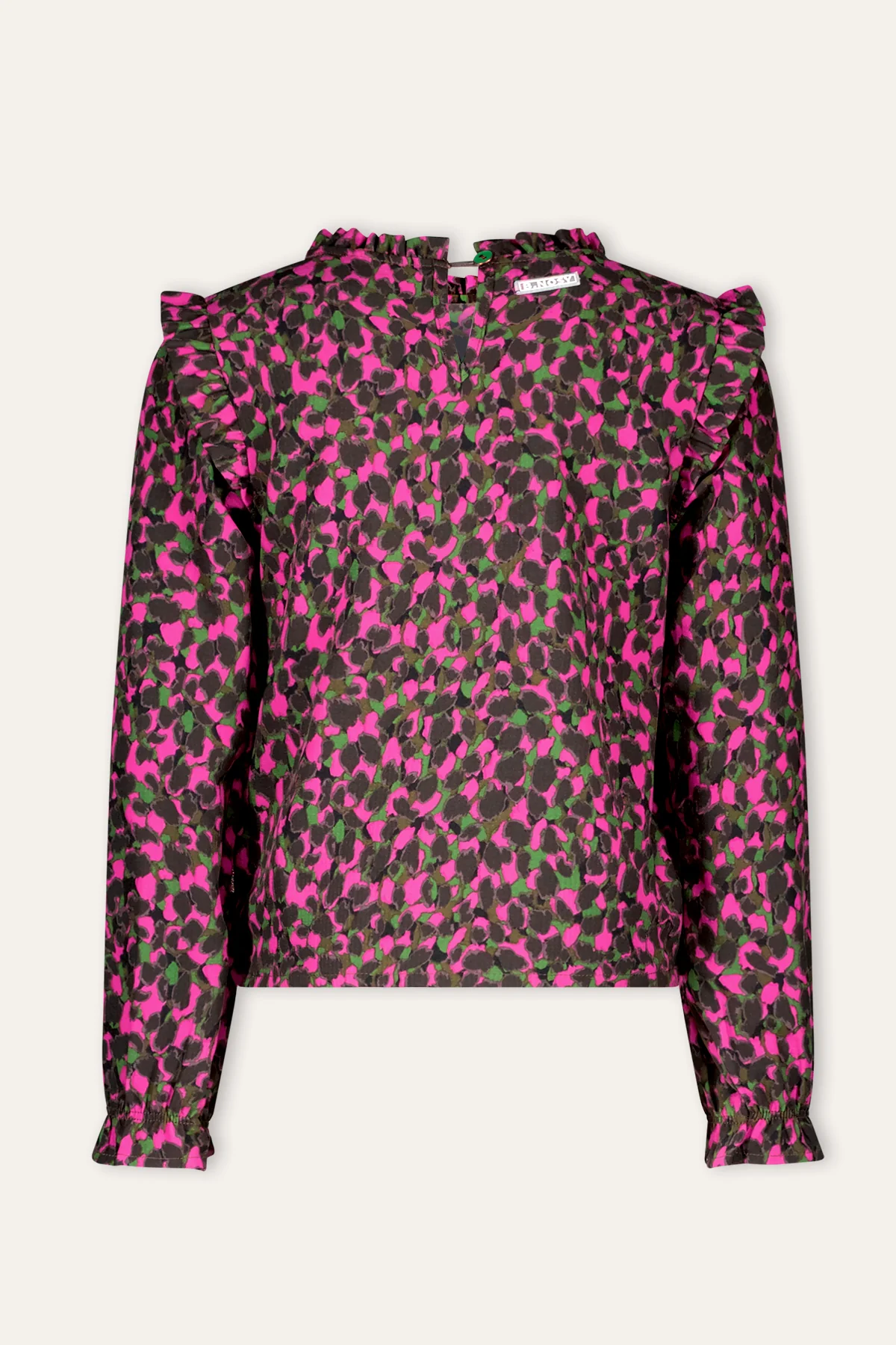 Blouse Ave heeft een stoere allover print in een toffe kleurencombinatie met grijs, fuchsia en groen. De ruffles op de schouders geven dit stoere shirtje een schattig effect. Combineer dit shirtje met een leuk rokje voor een schattige look of juist lekker stoer met één van onze denims!