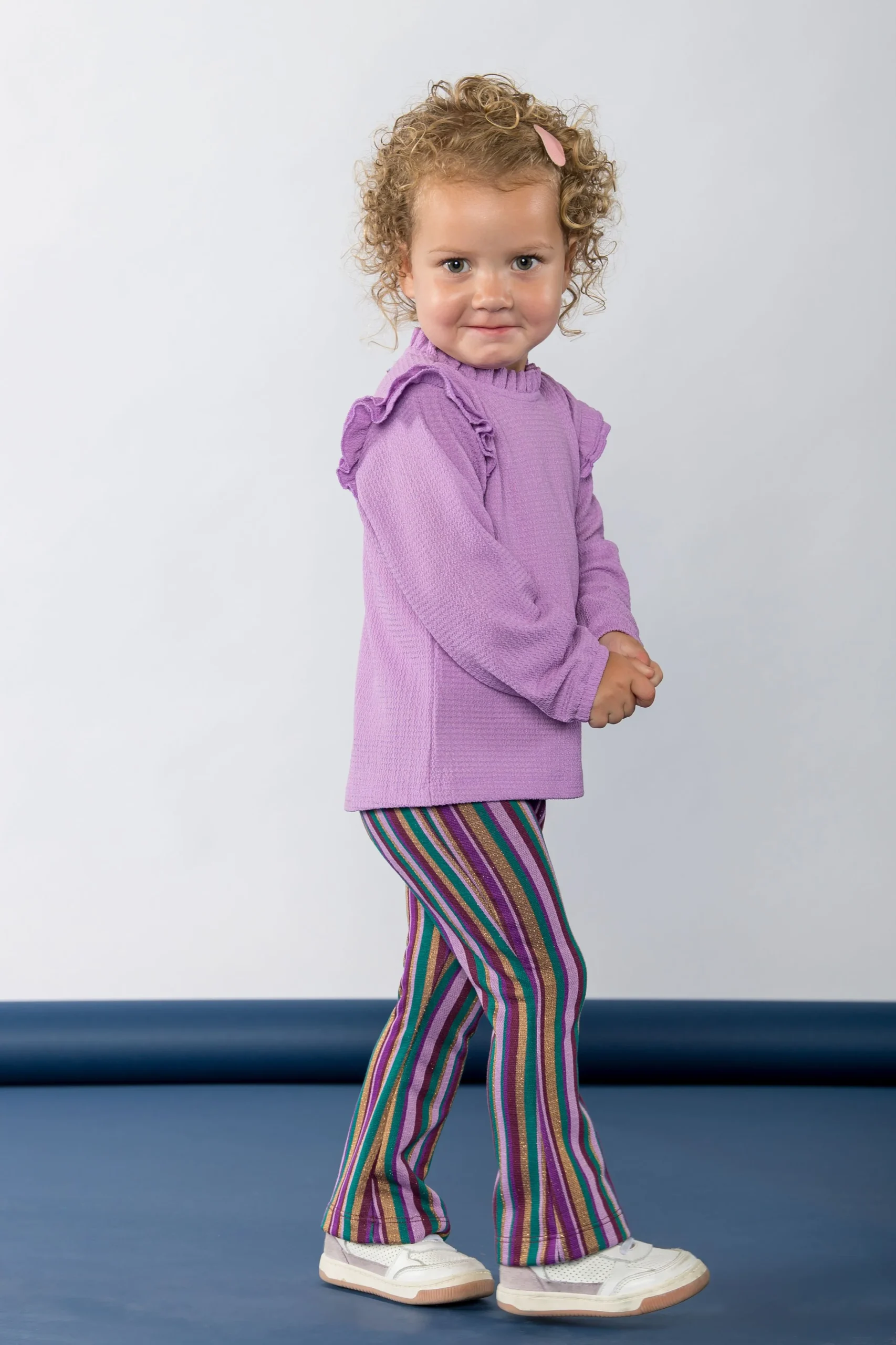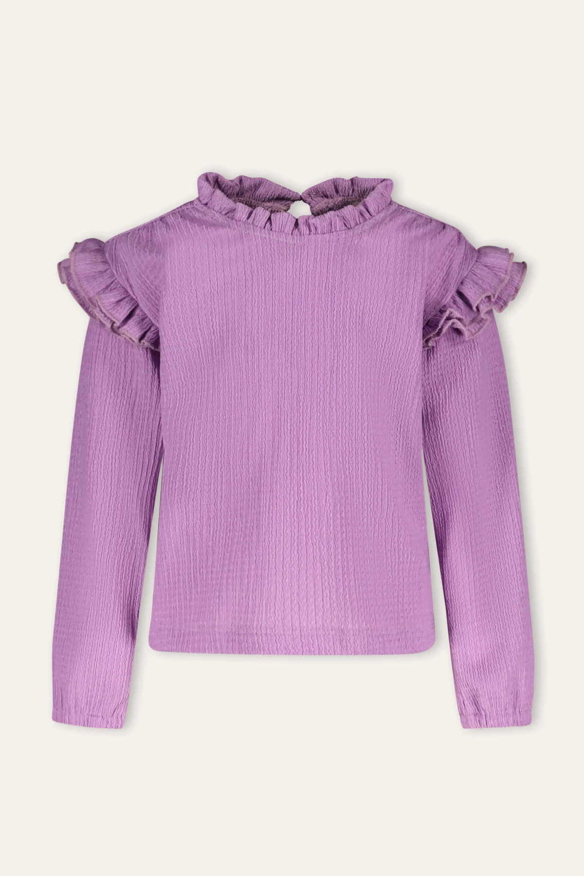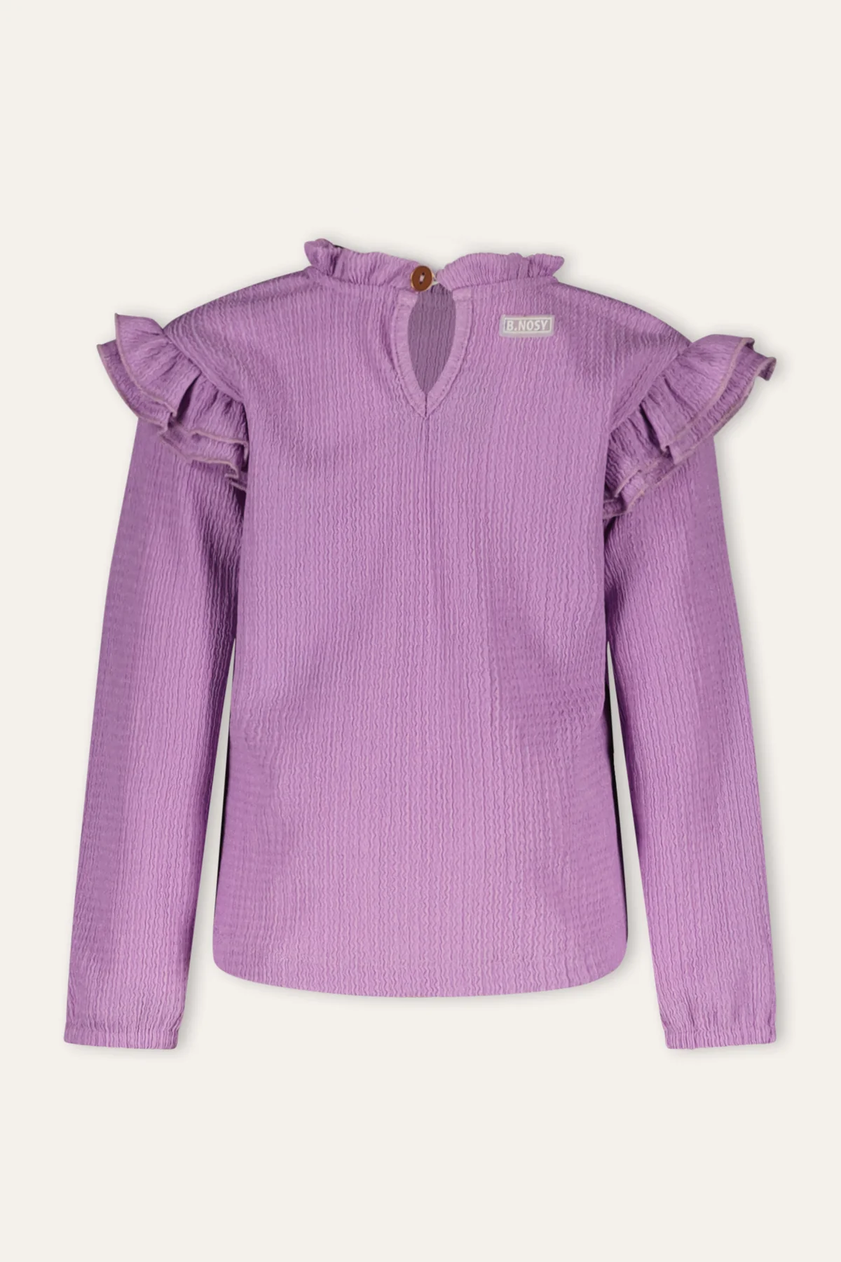 Stijlvol en comfortabel, de lila-kleurige blouse Becca van B.Nosy is een must-have voor je kleintje! Met een kleine turtle neck, schattige ruffle details op de schouders en gemaakt van recycled polyester, combineert deze blouse moeiteloos stijl en duurzaamheid. De blouse heeft een handig knoopje aan de achterkant voor gemakkelijk aan- en uittrekken. Combineer met de flared broekjes voor een speelse en vrolijke look!