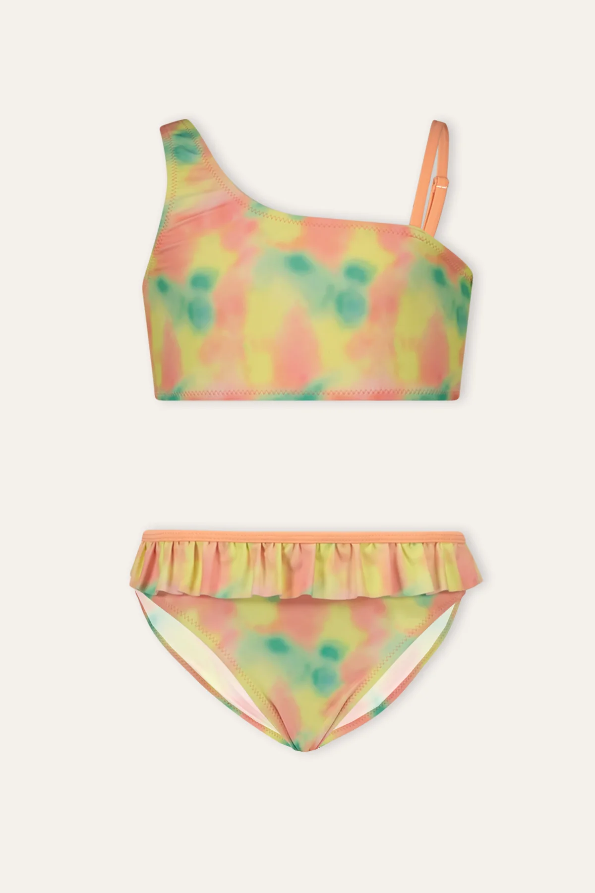 B.Nosy Wendy bikini heeft een one shoulder-effect met een smal verstelbaar bandje! De bikini heeft een kleurrijke print en het broekje heeft een leuke ruffel. Alle B.Nosy bikini’s zijn gemaakt van gerecycled polyester. Bovendien is deze bikini voorzien van een speciale UV protection. Extra veilig voor de zomerse zonnige dagen! Gaan we jou zien stralen in deze bikini?