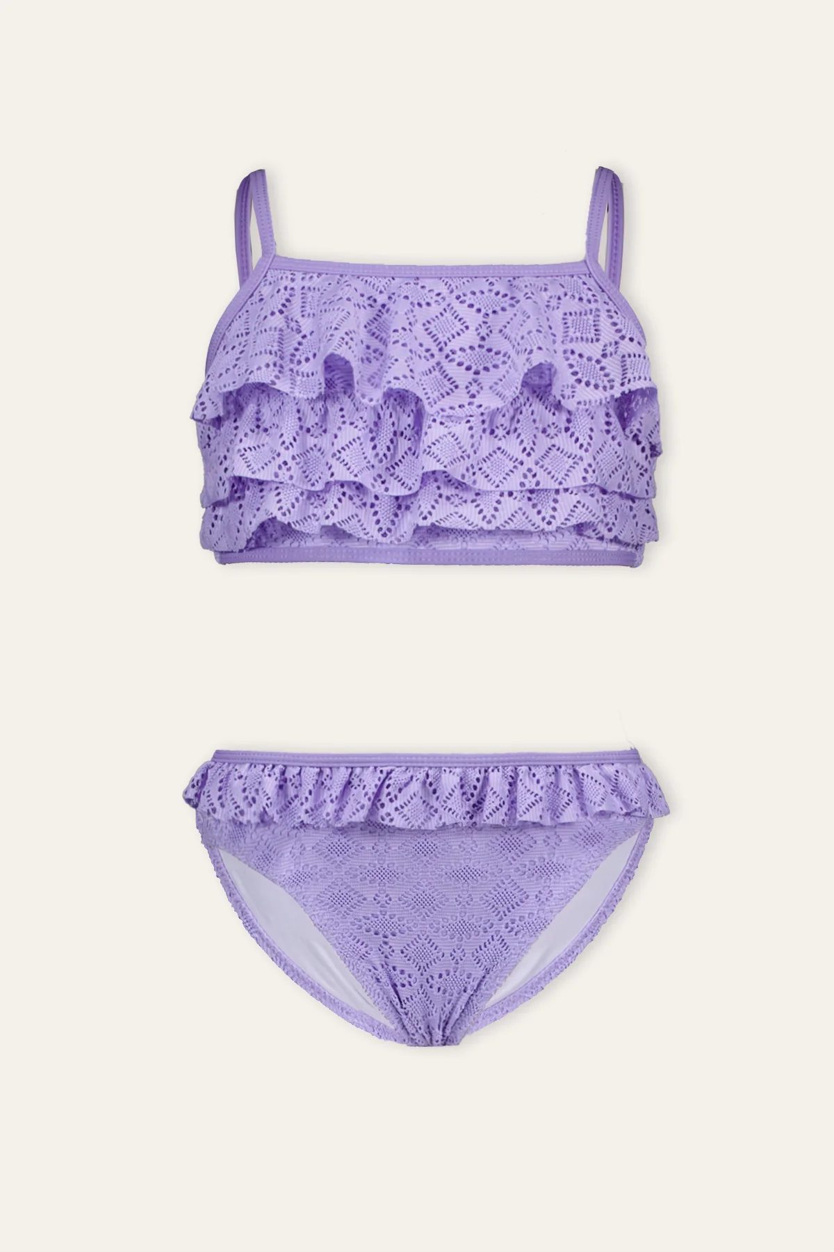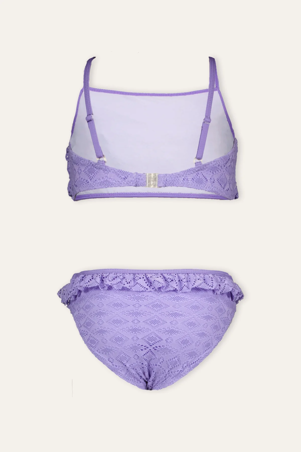 B.Nosy bikini Whitney is gemaakt van een mooie broderie stof en heeft leuke ruffles over de voorkant van het topje! Aan de achterzijde zit een clip sluiting en de bandjes zijn verstelbaar. Deze bikini is gemaakt van gerycycled polyester en is verkrijgbaar in twee kleuren!
