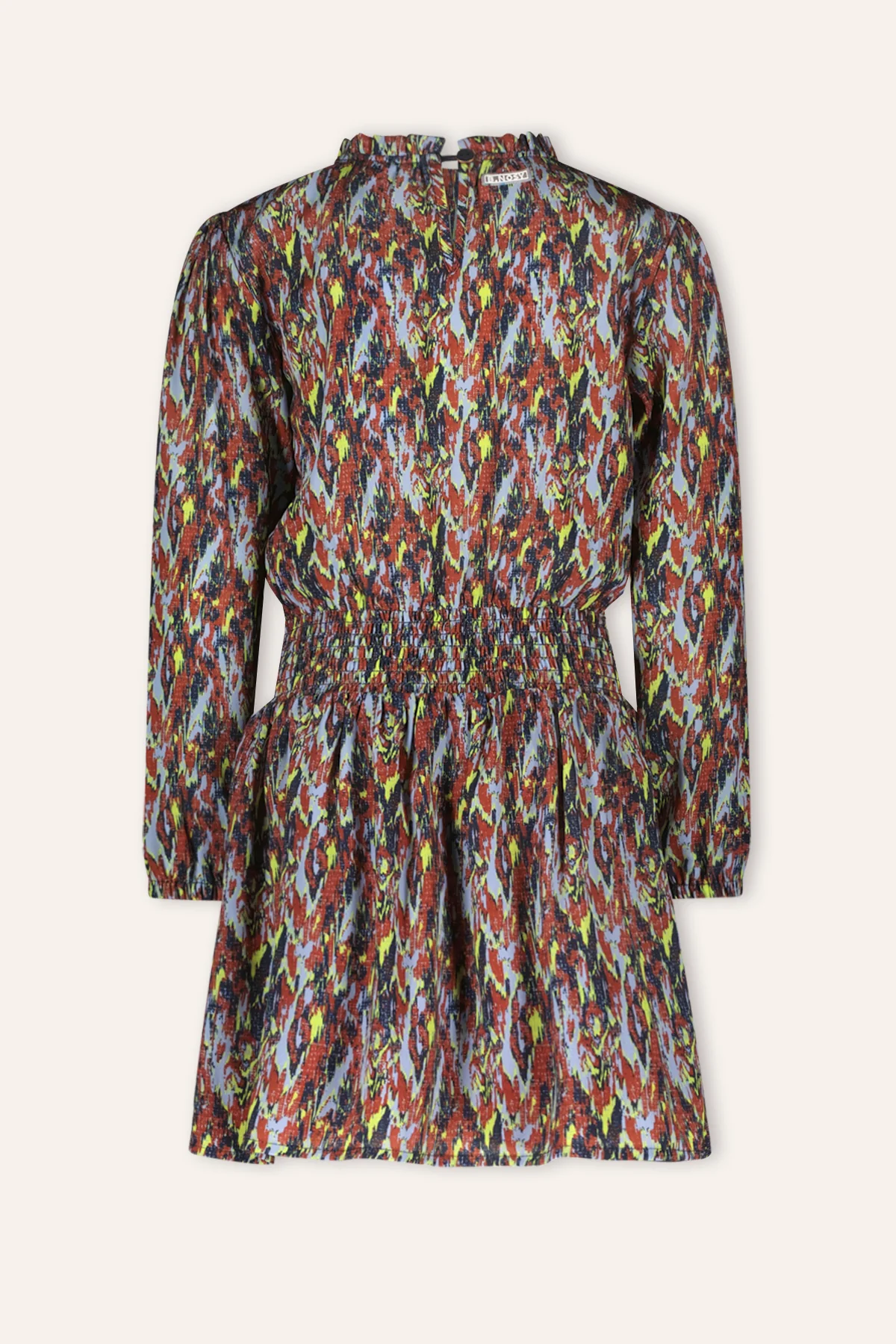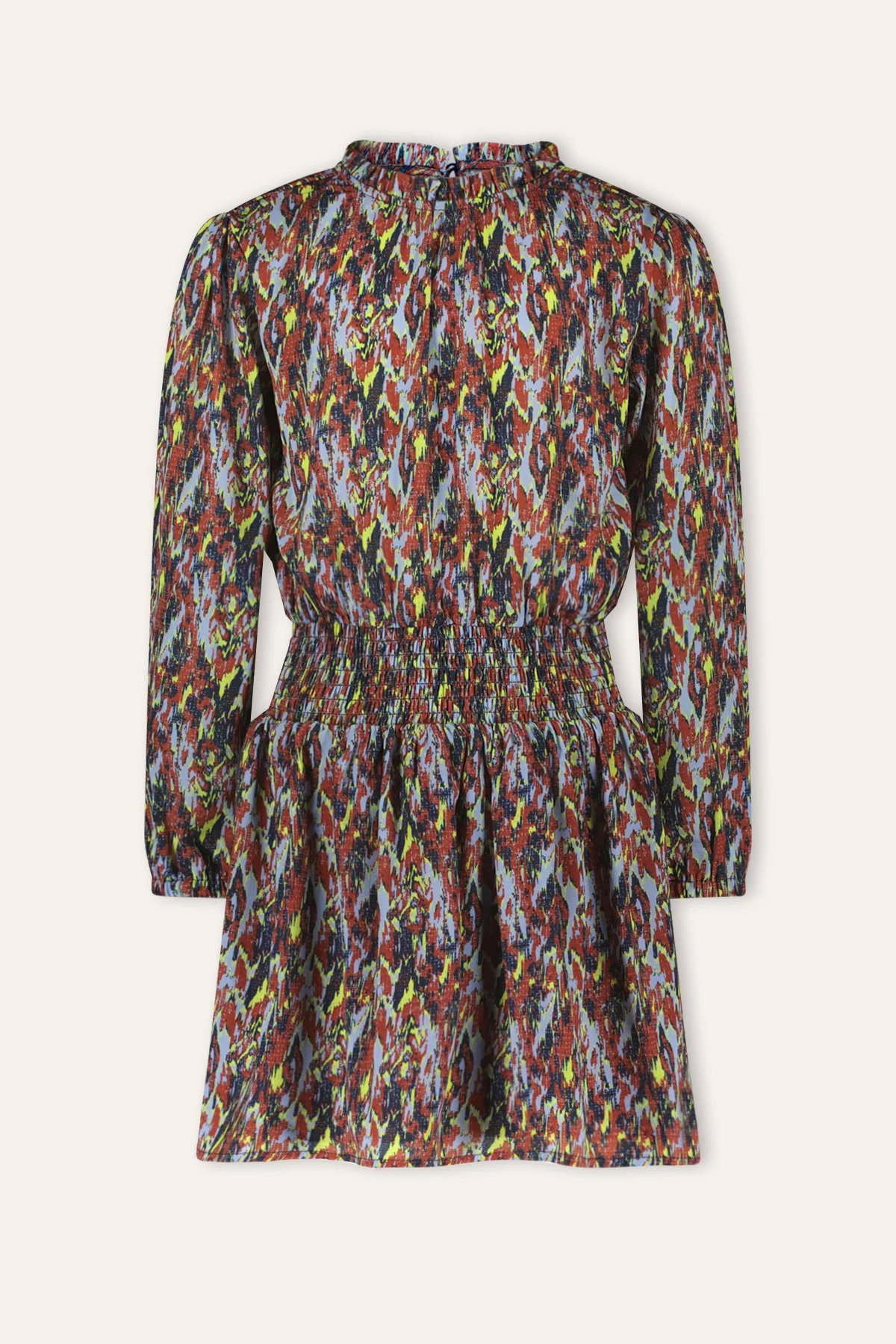 B.Nosy Dee dress is een perfecte keuze. Het jurkje heeft een abstracte print met een mix van mooie kleuren. Jurk Dee, is gemaakt van een geweven stof die een subtiele structuur heeft, en daarnaast ook gedeeltelijk van gerecycled polyester is. Je kunt het jurkje combineren met het Ginny reversible gilet.
