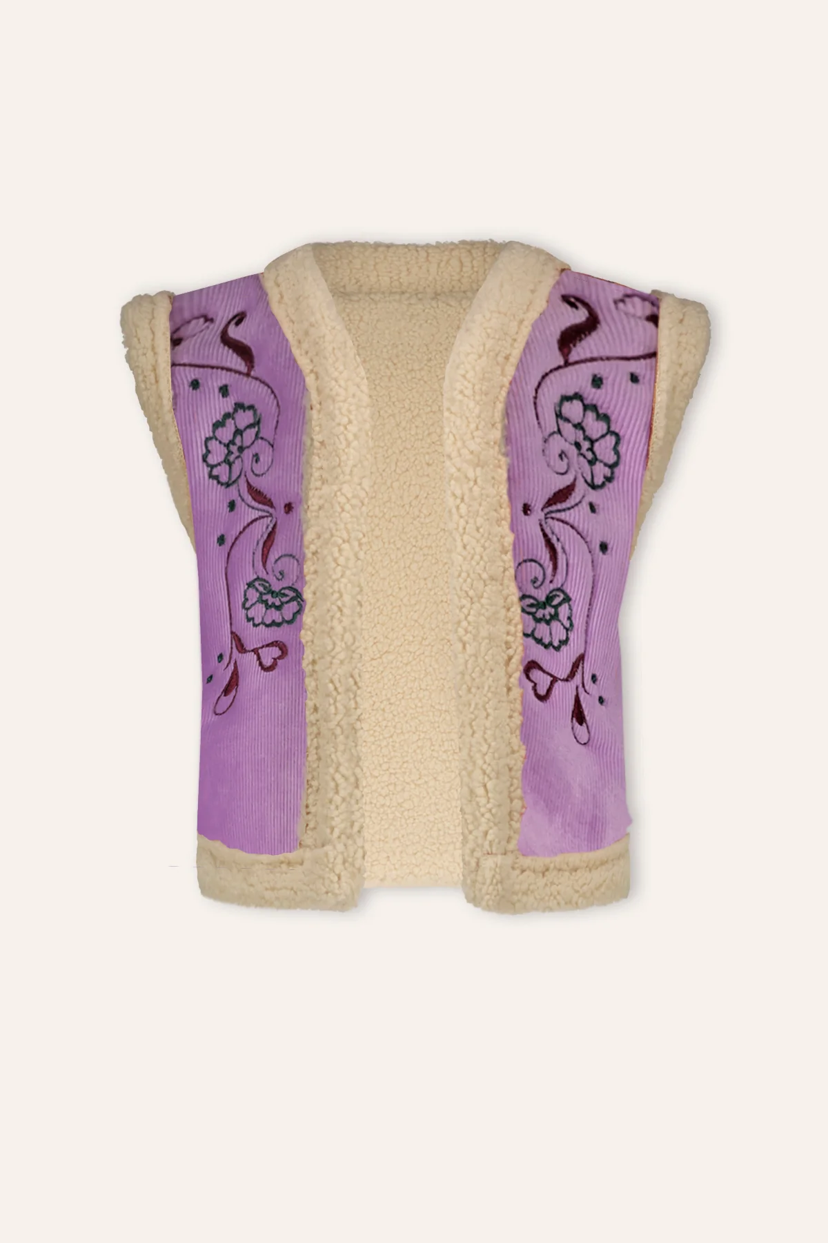 Voeg wat vrolijkheid toe aan de garderobe van je kleintje met het prachtige gilet Gemma van B.Nosy! Met een knuffelzachte teddy binnenkant en een luxueuze fake suede buitenkant in een mooie lila kleur, is dit gilet een absolute eyecatcher. Compleet met sierlijk borduurwerk voor een extra vleugje elegantie. Perfect om elke outfit op te fleuren!