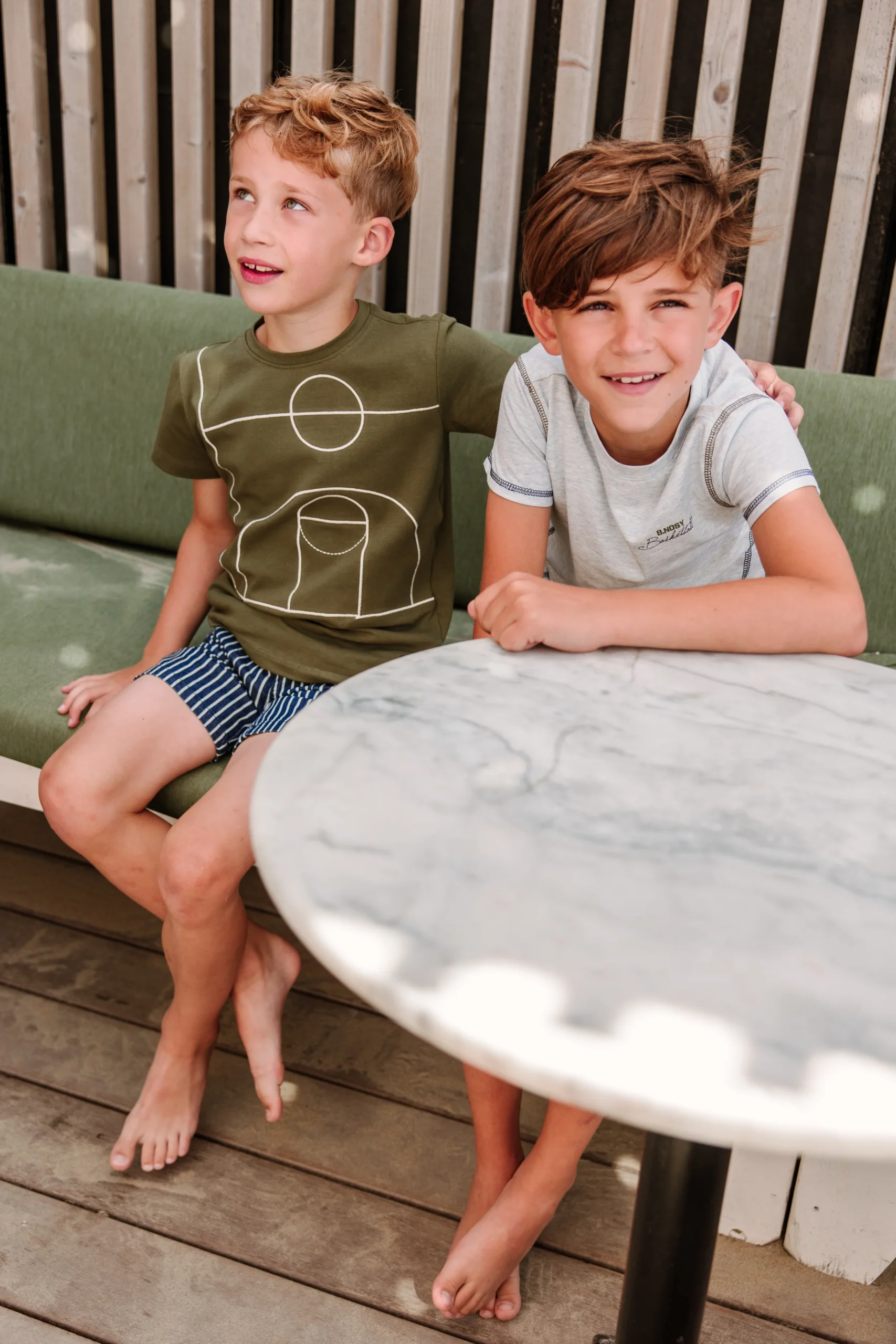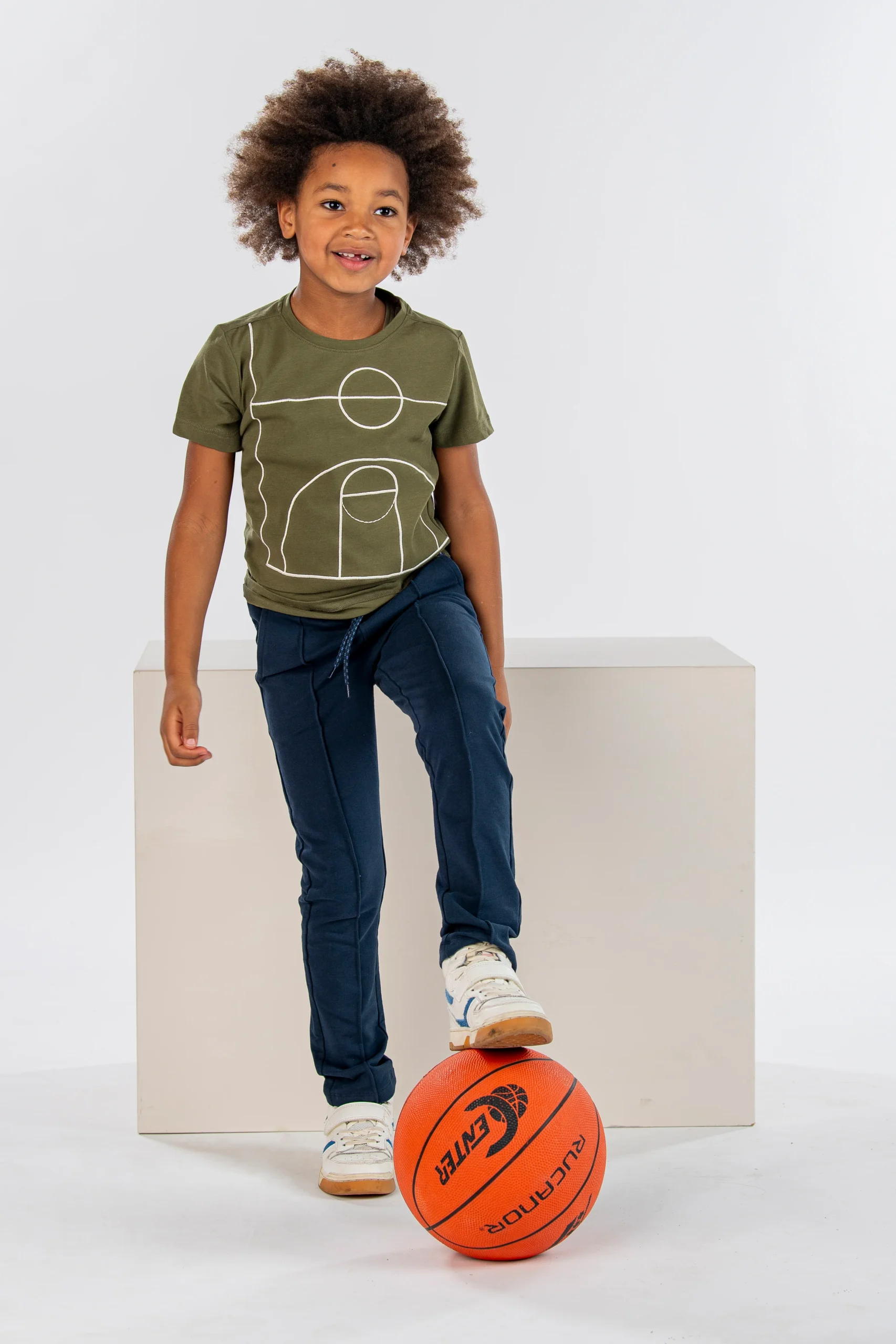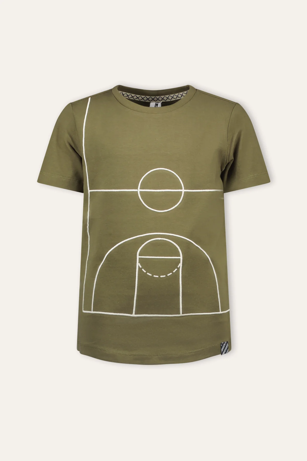 Score! Dat doe je zeker met dit leuke t-shirt! Dit groene jersey t-shirt genaamd Perry heeft een groot basketbal veld geborduurd op de voorzijde. Gemaakt van biologisch katoen.