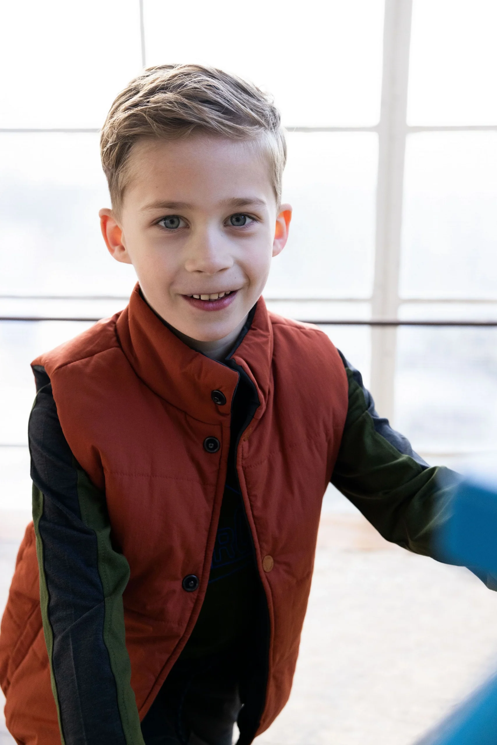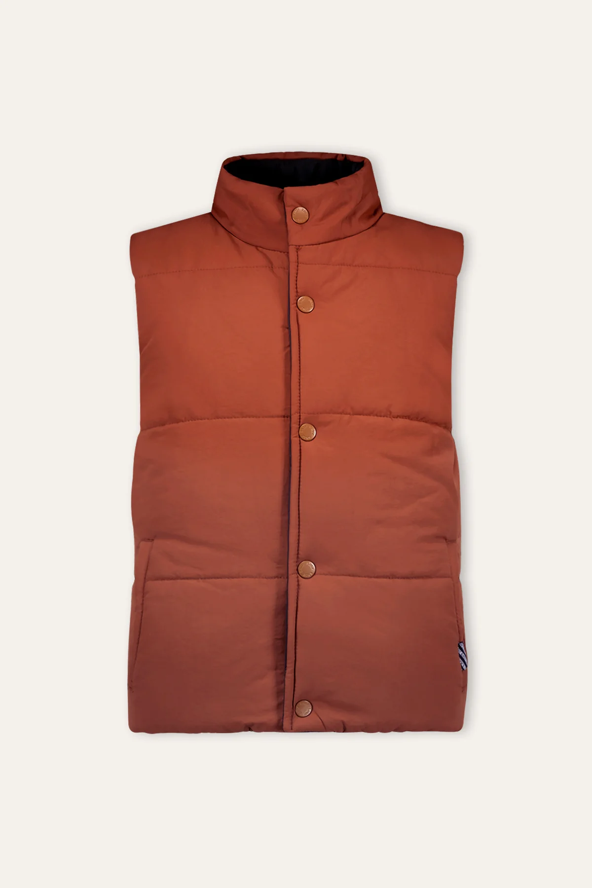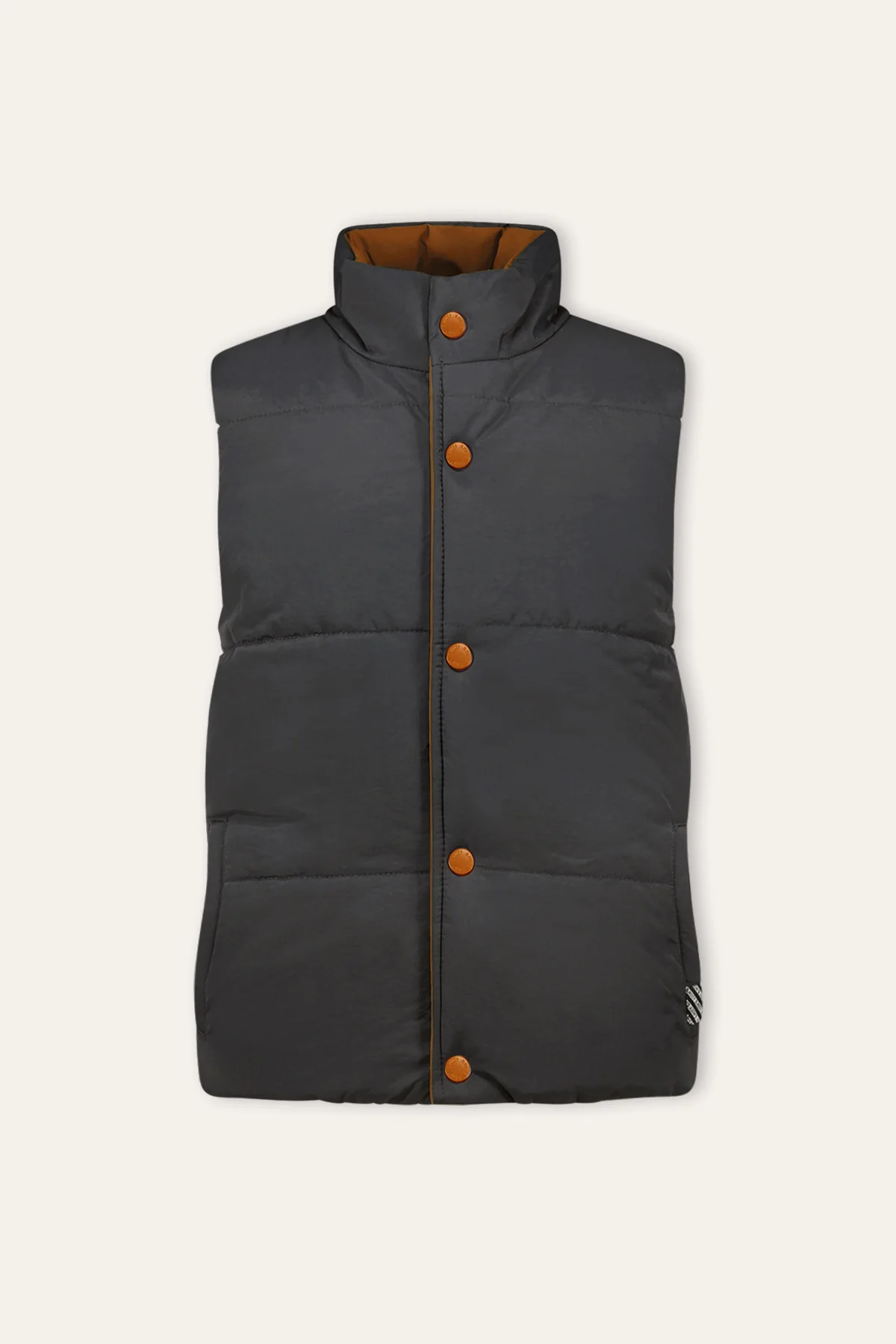 Kleed je kleine avonturier in stijl en warmte met de bodywarmer! Deze bodywarmer heeft twee geweldige looks in één, met een speelse gingerbread kleur aan de ene kant en een stoere antraciet kleur aan de andere kant. De bodywarmer is super comfortabel en combineert makkelijk!
