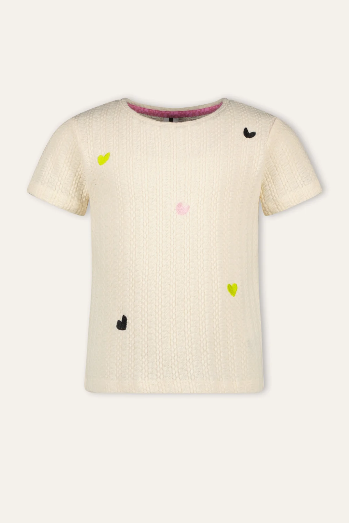 De ecru kleurige Tiff top heeft een super leuk hartjes borduur over het voorpand. De top is gemaakt van zacht katoen en heeft een leuke brei-effect.
