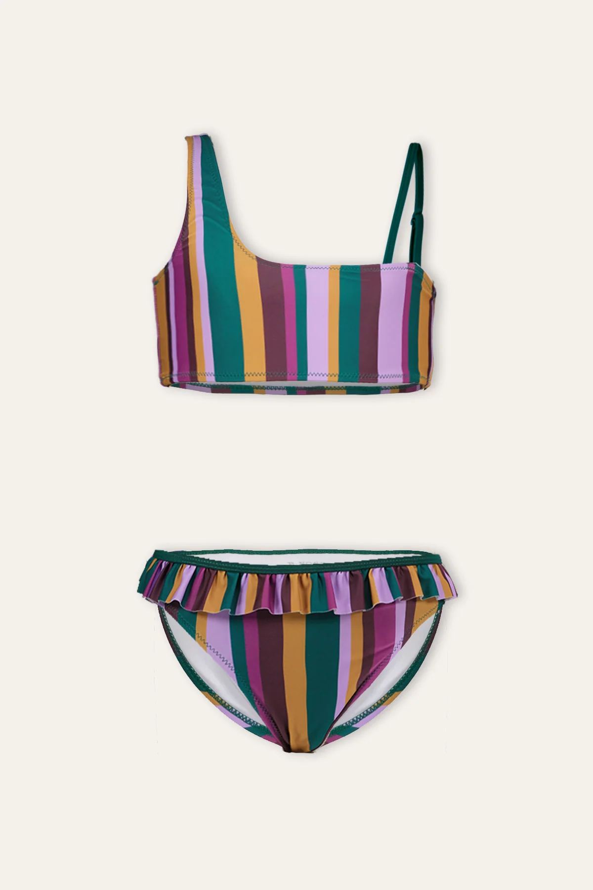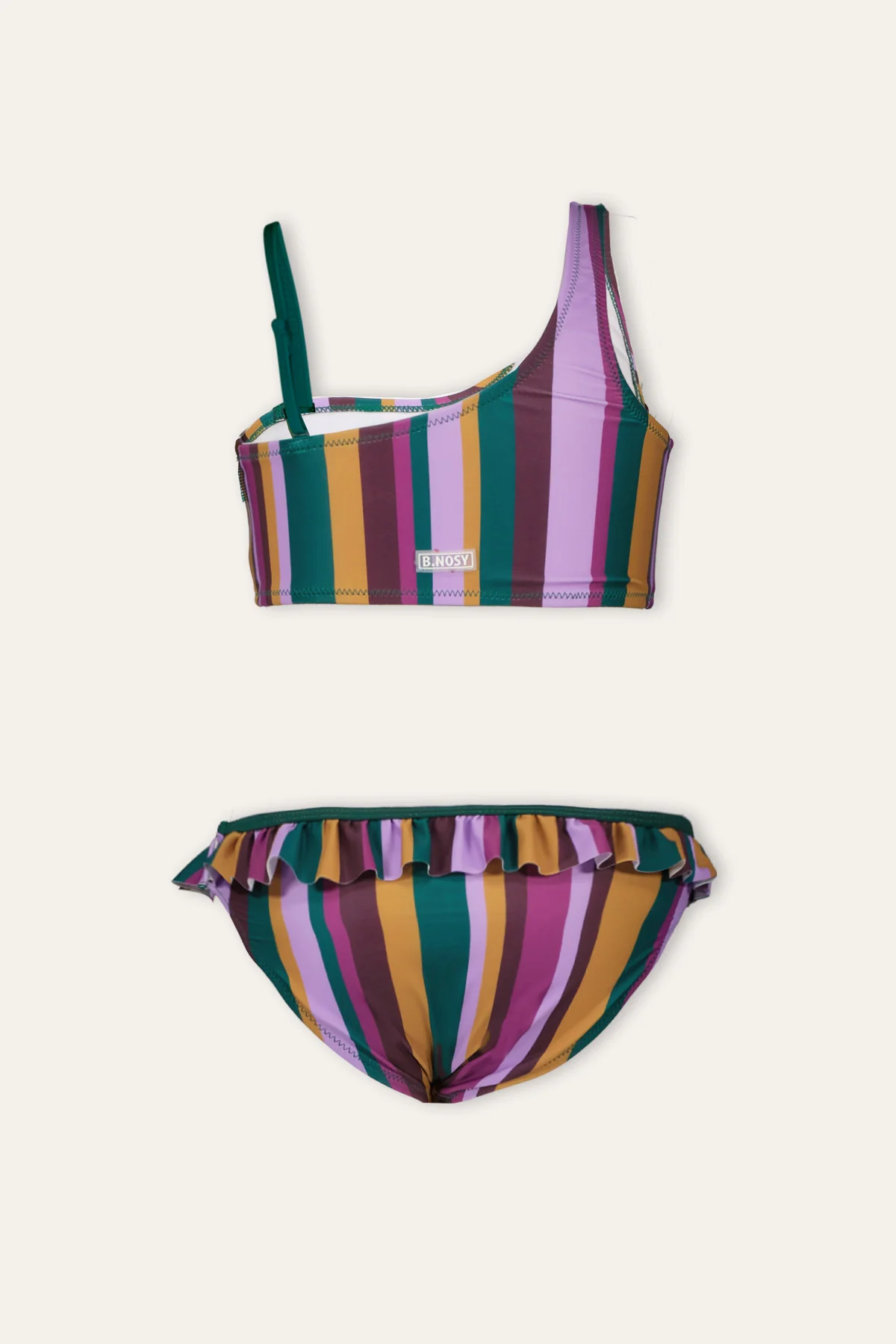 B.Nosy Wendy bikini heeft een one shoulder-effect, maar is dat niet! De bikini heeft een gestreept patroon met mooie warme kleuren. Voor comfort is de bikini aan het linker bandje verstelbaar. de bikin’s zijn gemaakt van gerecycled polyester. Beter voor de planeet! Bovendien is deze bikini voorzien van een speciale UV protection. Extra veilig voor de zomerse zonnige dagen! Gaan we jou zien stralen in deze bikini?