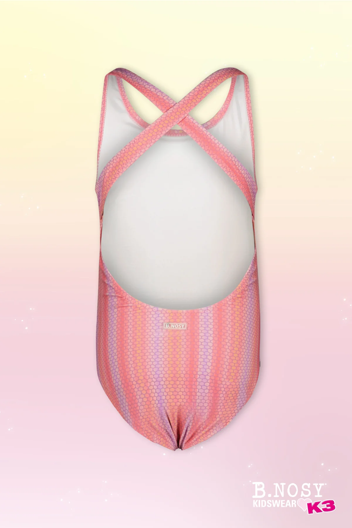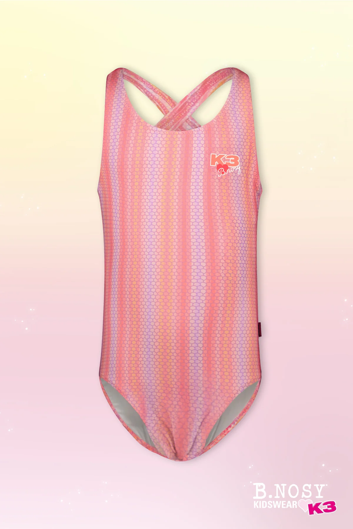 Het B.Nosy x K3 badpak Wila mermaid in roze en paarse kleuren is een speels en trendy item voor jonge zwemfans. Dit badpak heeft een schattige zeemeermin print en comfortabele gekruiste bandjes, perfect voor een dag aan het water. Combineer het voor een complete look met een vrolijk strandlaken. Ideaal voor ieder plezier in het zwembad of de zee! Gemaakt van gerecycled polyester en met een UV laag voor extra bescherming!
