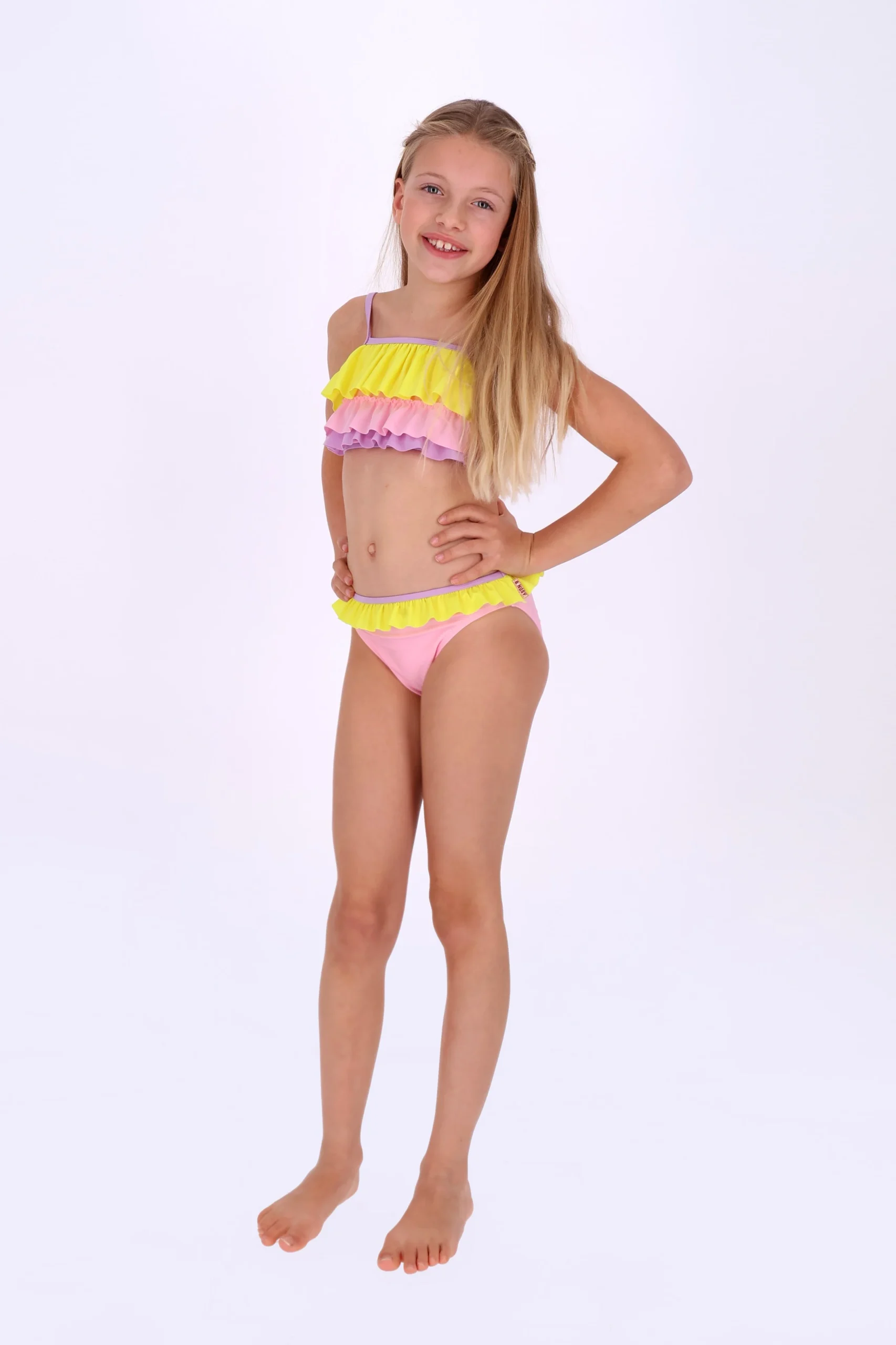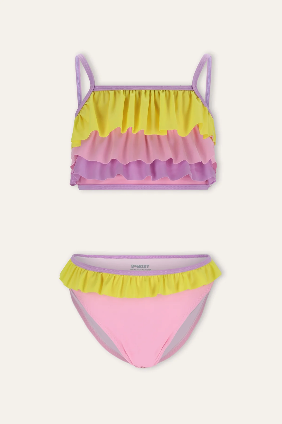 Maak een splash deze zomer met de vrolijke en speelse B.Nosy Bikini Whitney in een mooie roze tint! Deze bikini is perfect voor jouw kleine meid en ideaal voor alle zomerse avonturen. De 3 lagen ruffle in groen, roze en paars geven het geheel een extra vrolijke uitstraling. Het is gemaakt van gerecycled polyester en zit comfortabel, zodat je vrij kan bewegen en stralen. Een must-have voor in de zwemgarderobe!