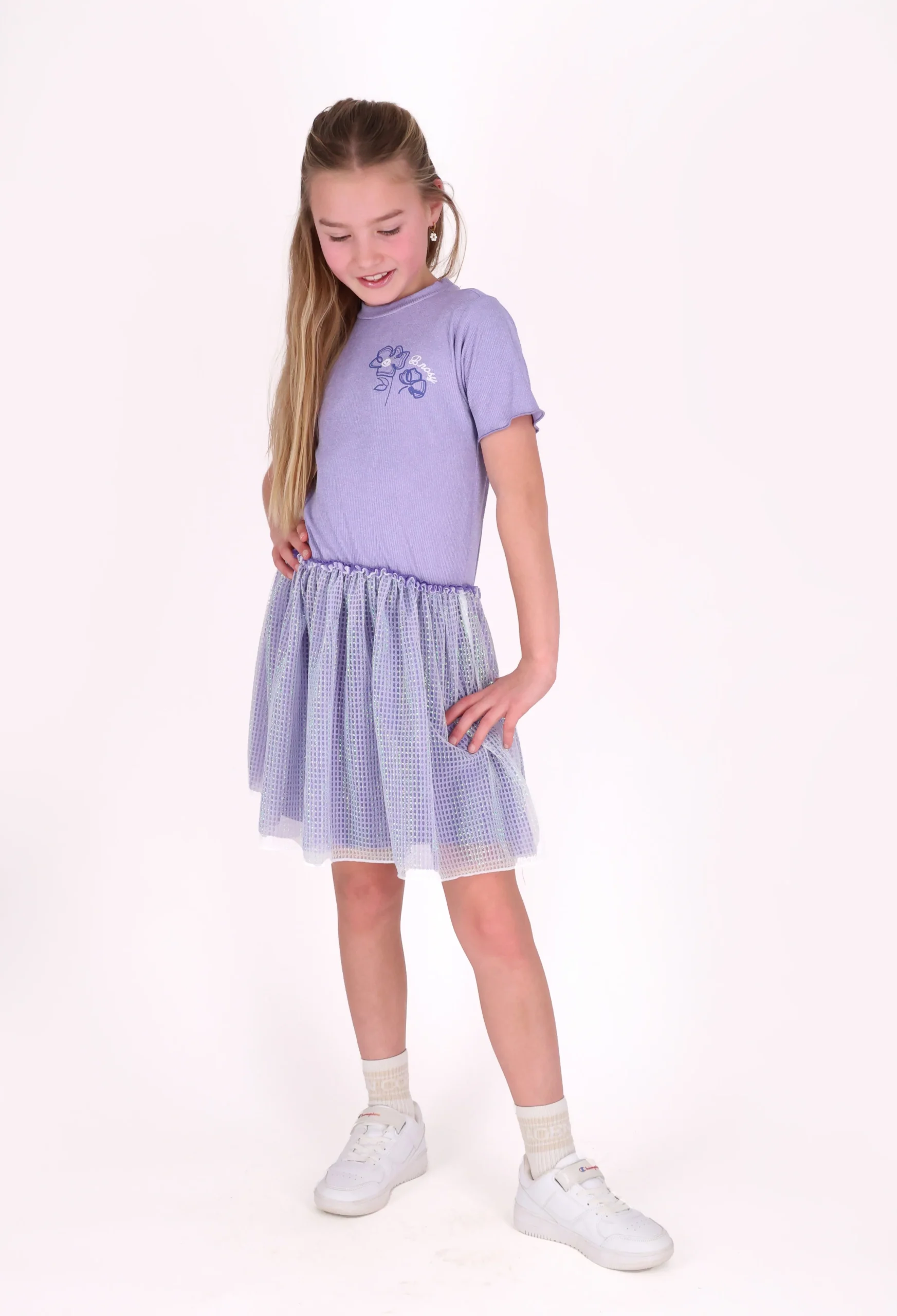 Deze speelse jurk van B.Nosy is een echte must-have voor elke meid. Het unieke design met een t-shirt bovenstuk en een rok met vallende mesh stof, verbonden door een glitterband, maakt dit jurkje super trendy. De lila kleur is een vrolijke toevoeging aan elke garderobe.