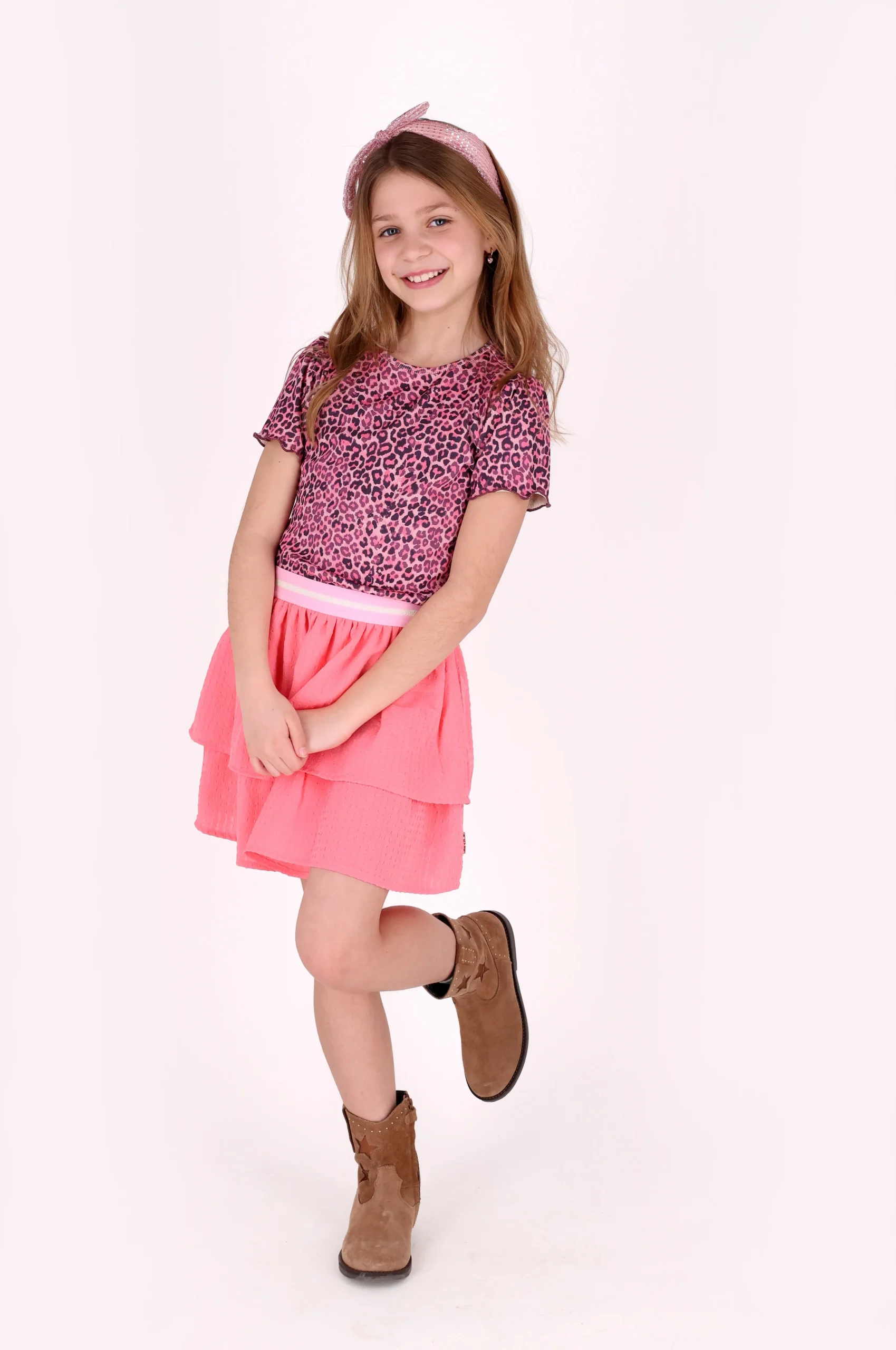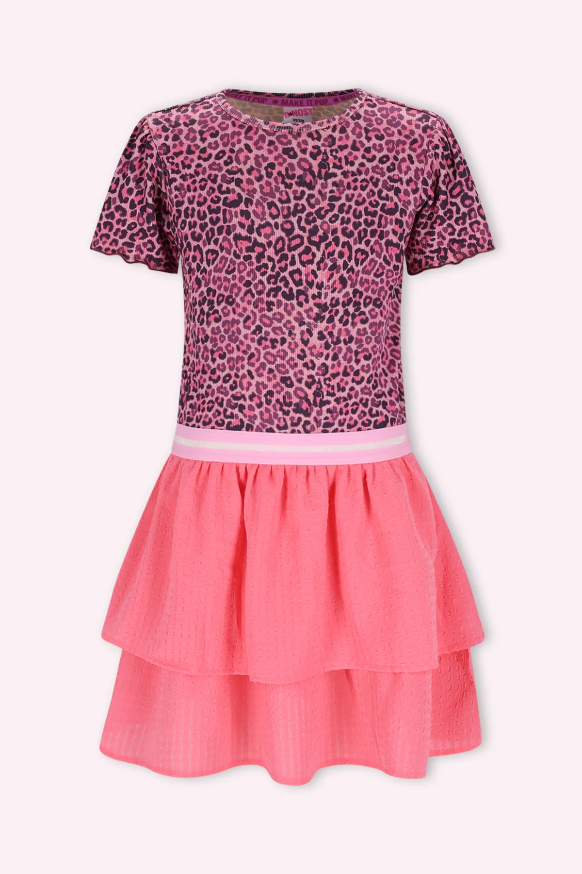 Tover een glimlach op ieders gezicht met deze super leuke B.Nosy Dolly jurk! Gemaakt voor meiden die graag stralen, is deze jurk een echte eyecatcher. De combinatie van een zachte top met een vrolijke luipaard print en een rok met structuur maakt dit een must-have item. Perfect om te mixen en matchen met een legging of jasje voor een toffe outfit!