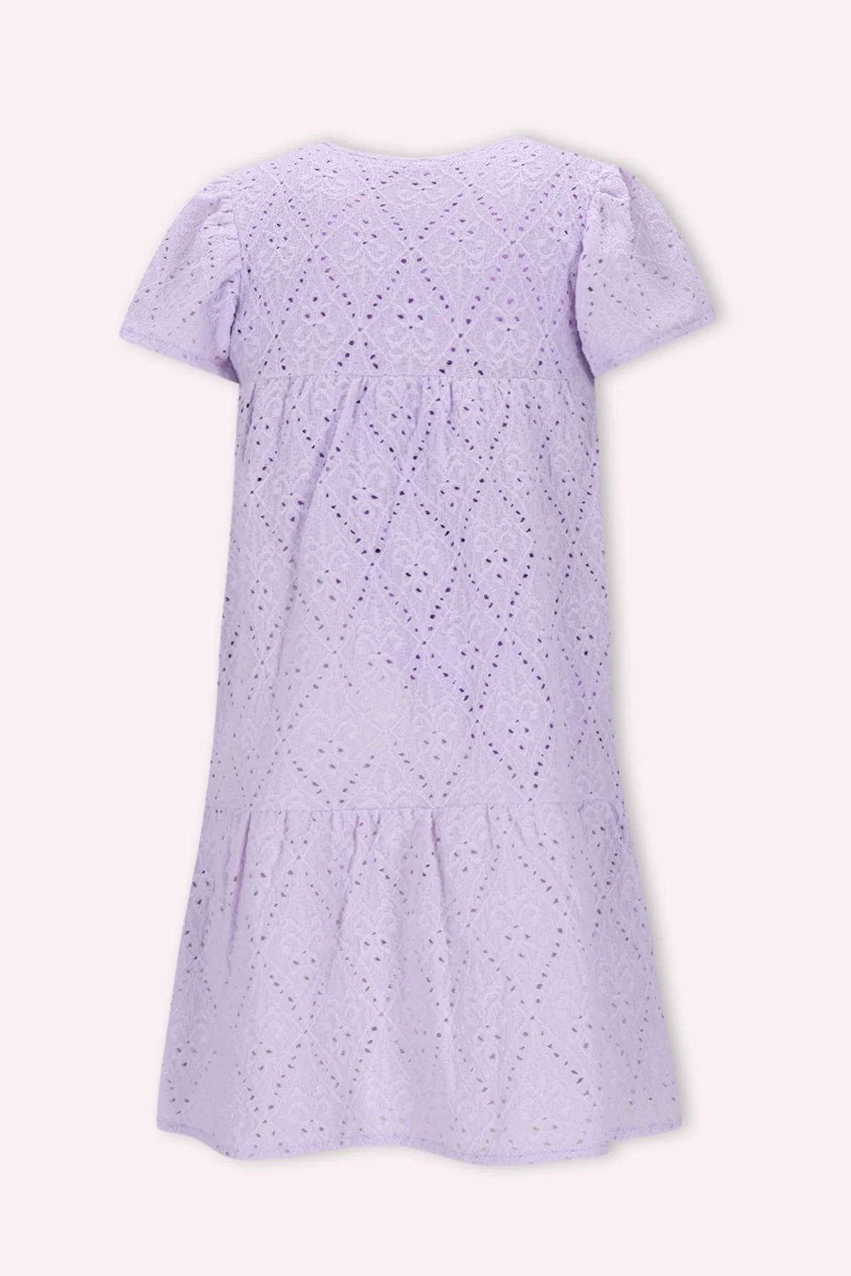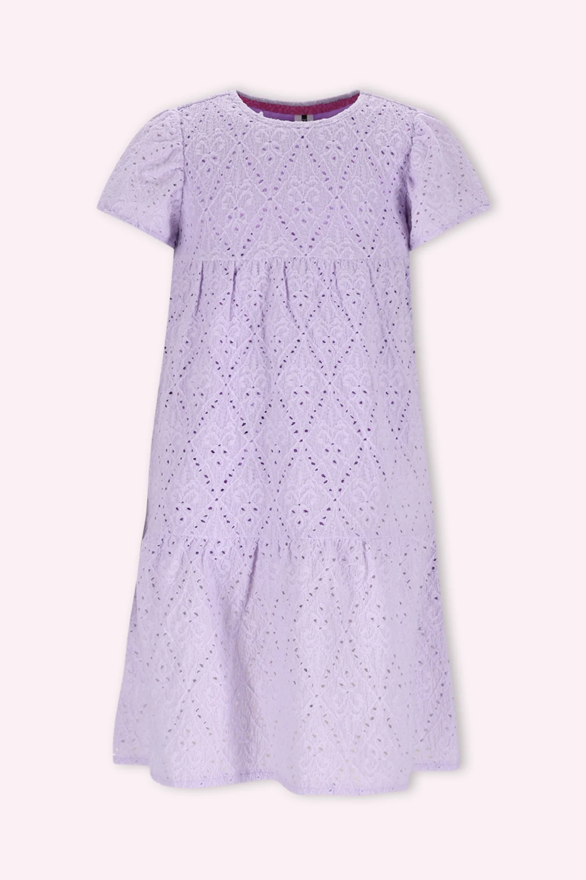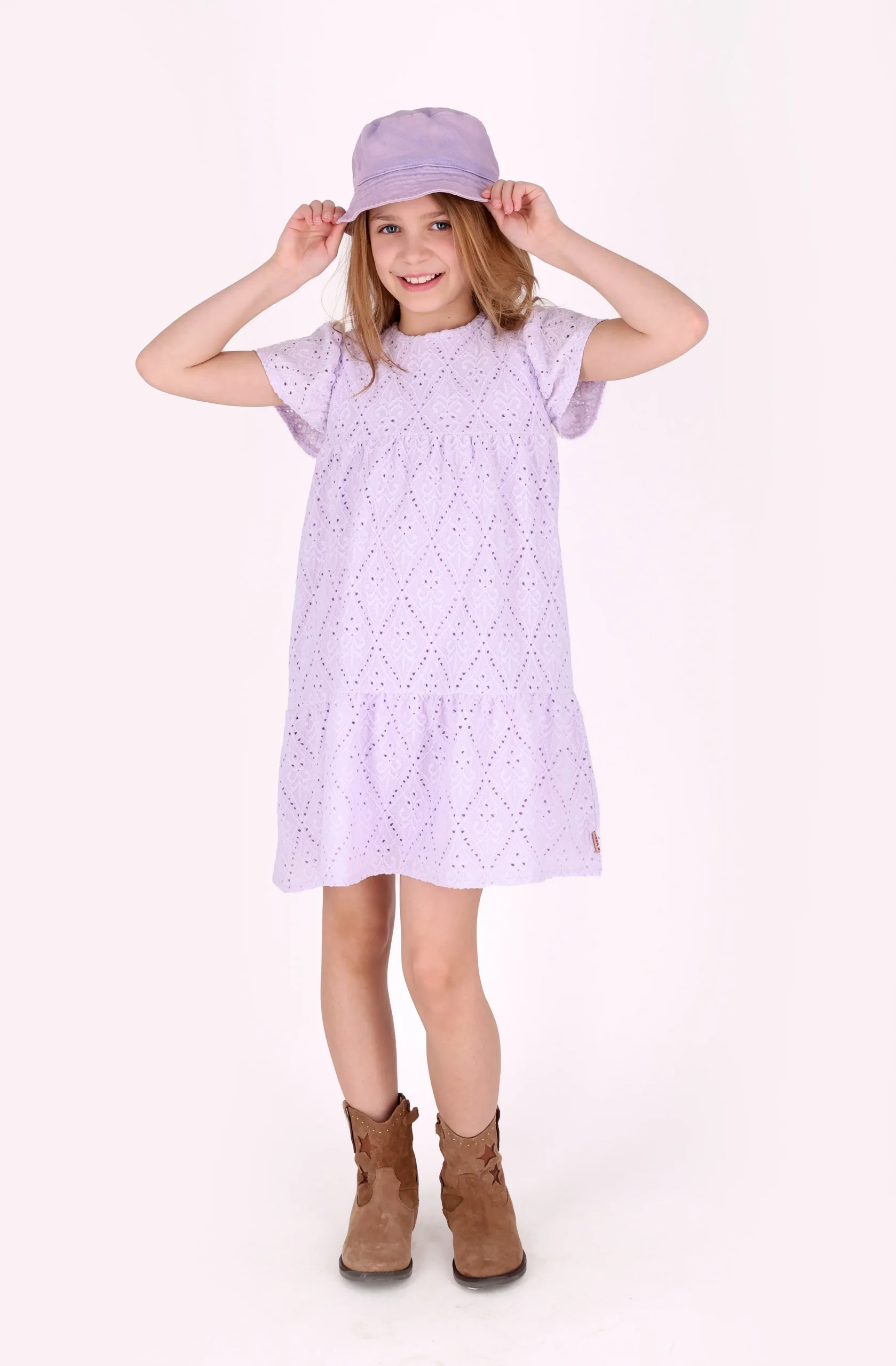 Deze toffe jurk van B.Nosy is een must-have voor jouw meid! De jurk is uitgevoerd in een prachtige lavendel paarse kleur en heeft broderie stof met rek, wat zorgt voor extra comfort. De wijd uitlopende korte mouwen geven de jurk een speelse en trendy look. Perfect om te combineren met de scrunchie Ally voor een complete outfit.