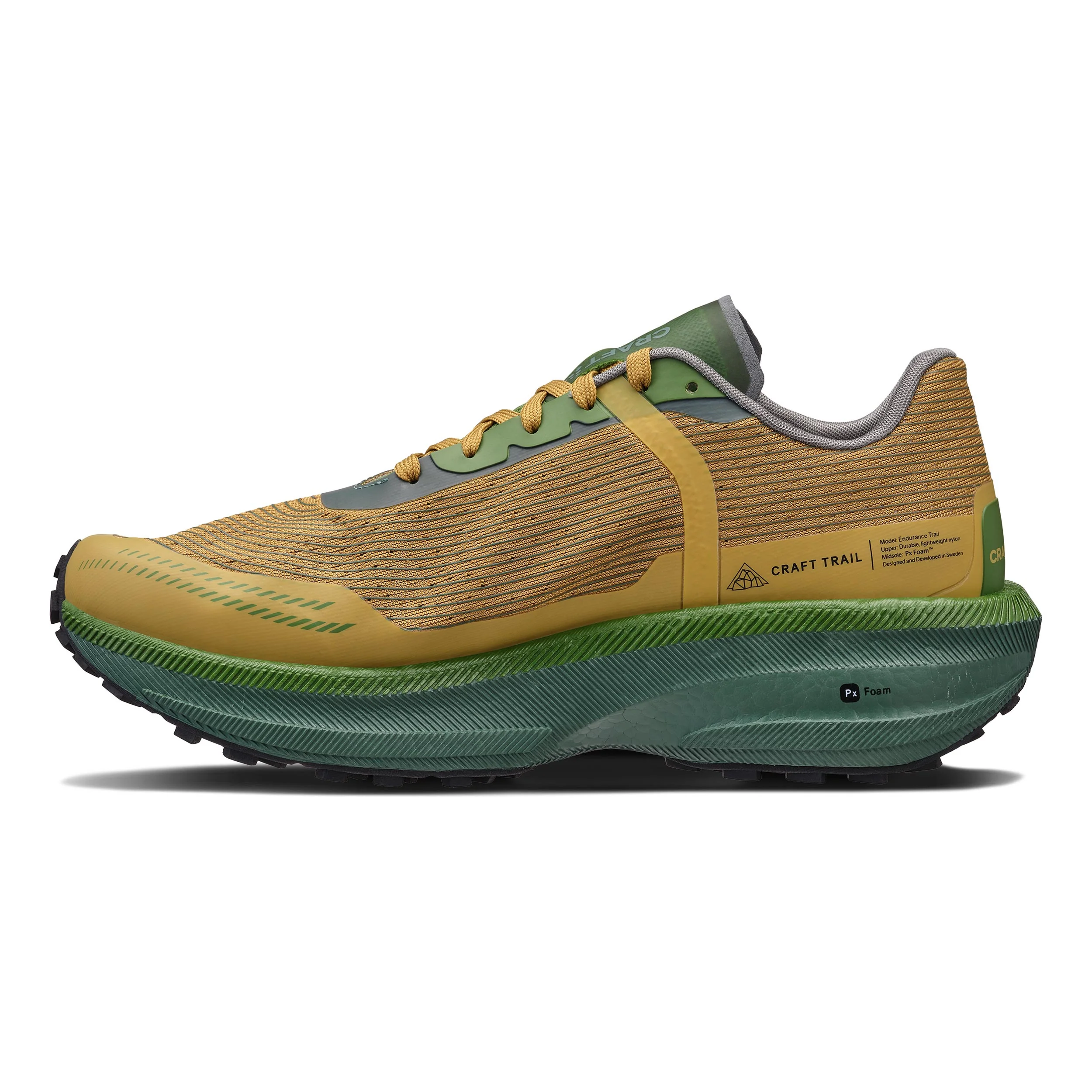 Bij voorkeur over heuvels en dalen, over smalle, ongelijke paden. Dit is je passie en de beste plek om je uit te leven. De hoogwaardige Endurance Trail off-road schoen van Craft scoort punten met zijn comfortabele, naadloze pasvorm van nauwsluitend meshweefsel en maakt indruk met zijn milieuvriendelijke Px Foam tussenzool, die je stappen zacht dempt en je helpt een krachtige impact te maken. De grof geprofileerde rubberen buitenzool is flexibel en zorgt voor stevigheid en tractie. Je kunt je nu al verheugen op je volgende avontuur in de buitenlucht!