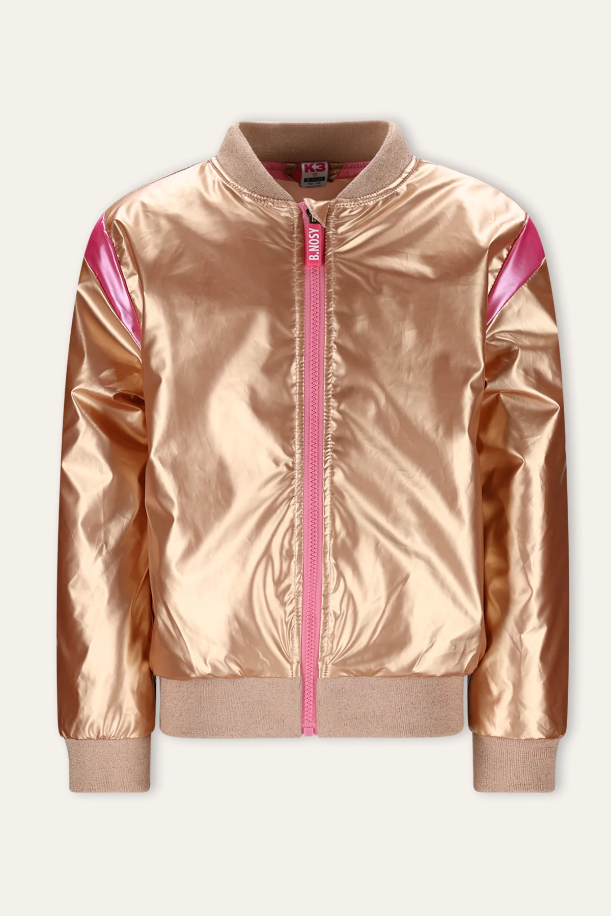 B.Nosy K3 Bomber Jas in goud is een echte must-have voor elke stijlvolle K3 fan! Het K3-logo op de rug voegt een speels element toe en maakt het een perfect fashion statement. Ideaal voor alledaagse outfits of speciale gelegenheden, en goed te combineren met jouw favoriete B.Nosy x K3 outfit.