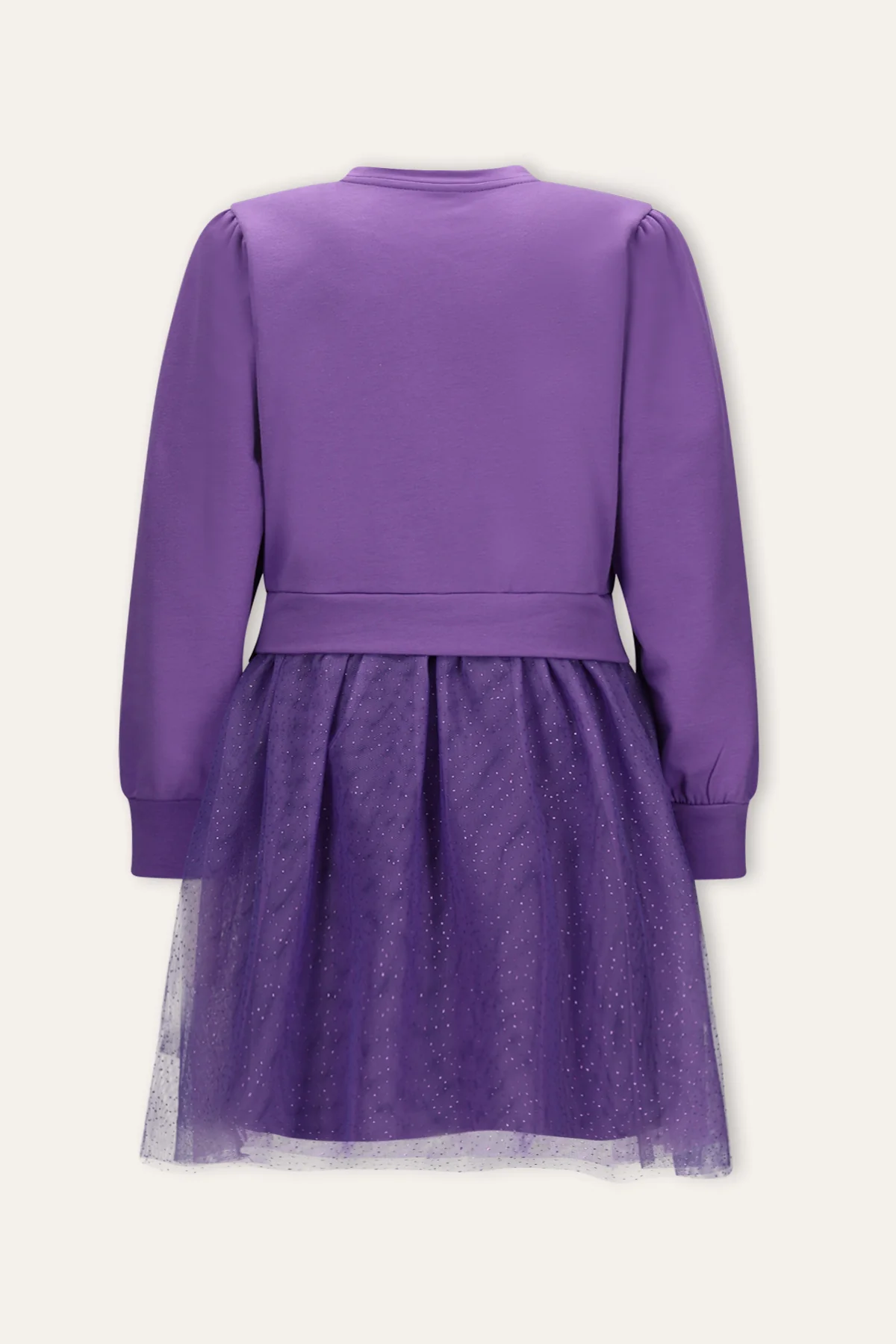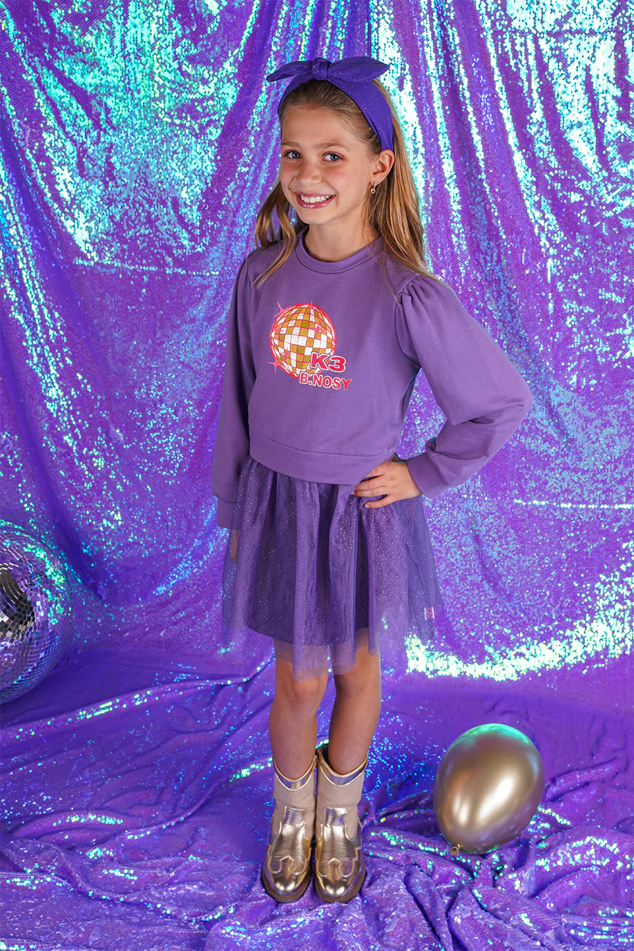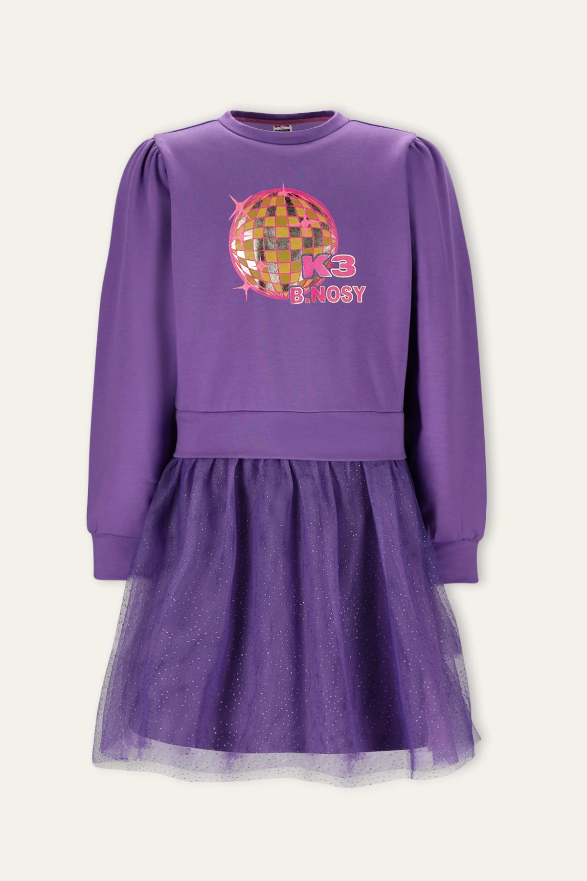 Steel de show met deze B.Nosy x K3 jurk Dasha. De jurk heeft een toffe print van een discobal met het K3 logo, en een tule ruk met glitters erop. Door de fijne sweatstof zit deze jurk heerlijk.