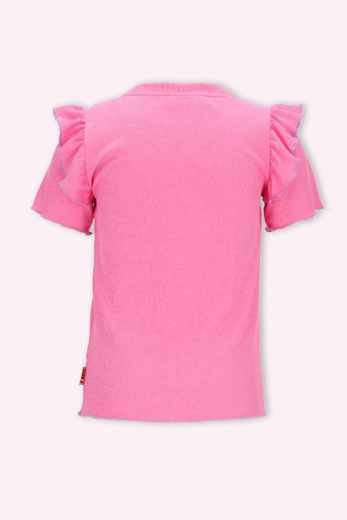 Een super leuke en comfortabele top voor meiden van B.Nosy. Deze licht roze top is perfect voor een zomerse dag. De schouders zijn versierd met een vrolijke ruffel en op de borst pronkt een klein, schattig artwork. Een trendy item dat je outfit meteen laat stralen.