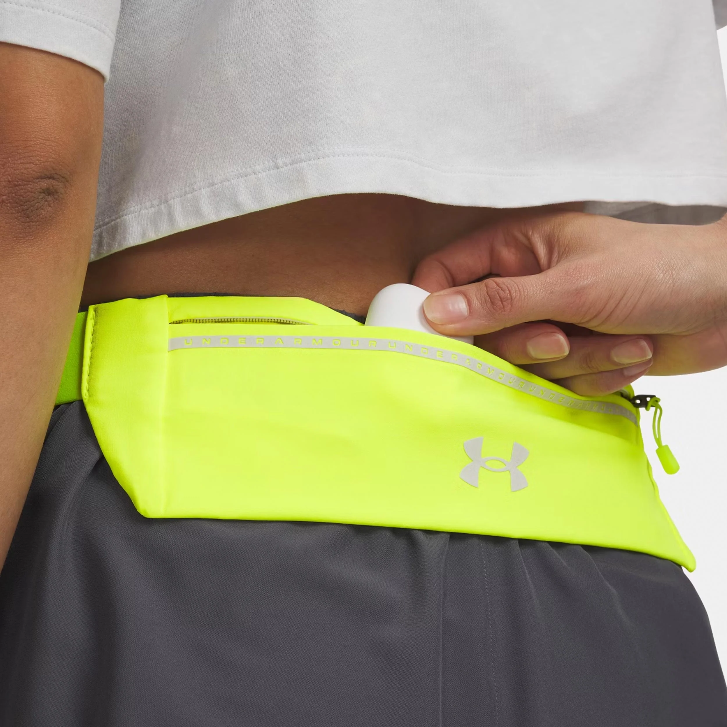 De Under Armour Velociti Run hardloopriem is de perfecte oplossing voor iedereen die niet zonder belangrijke spullen wil tijdens het trainen. Of het nu gaat om een smartphone, sleutels of energiegels – deze hardloopriem biedt doordachte opbergruimte zonder in de weg te zitten tijdens het hardlopen. De geïntegreerde speed pocket beschermt je mobiele telefoon betrouwbaar tegen beweging en vocht, terwijl alles dicht tegen je lichaam zit en niet wegglijdt.